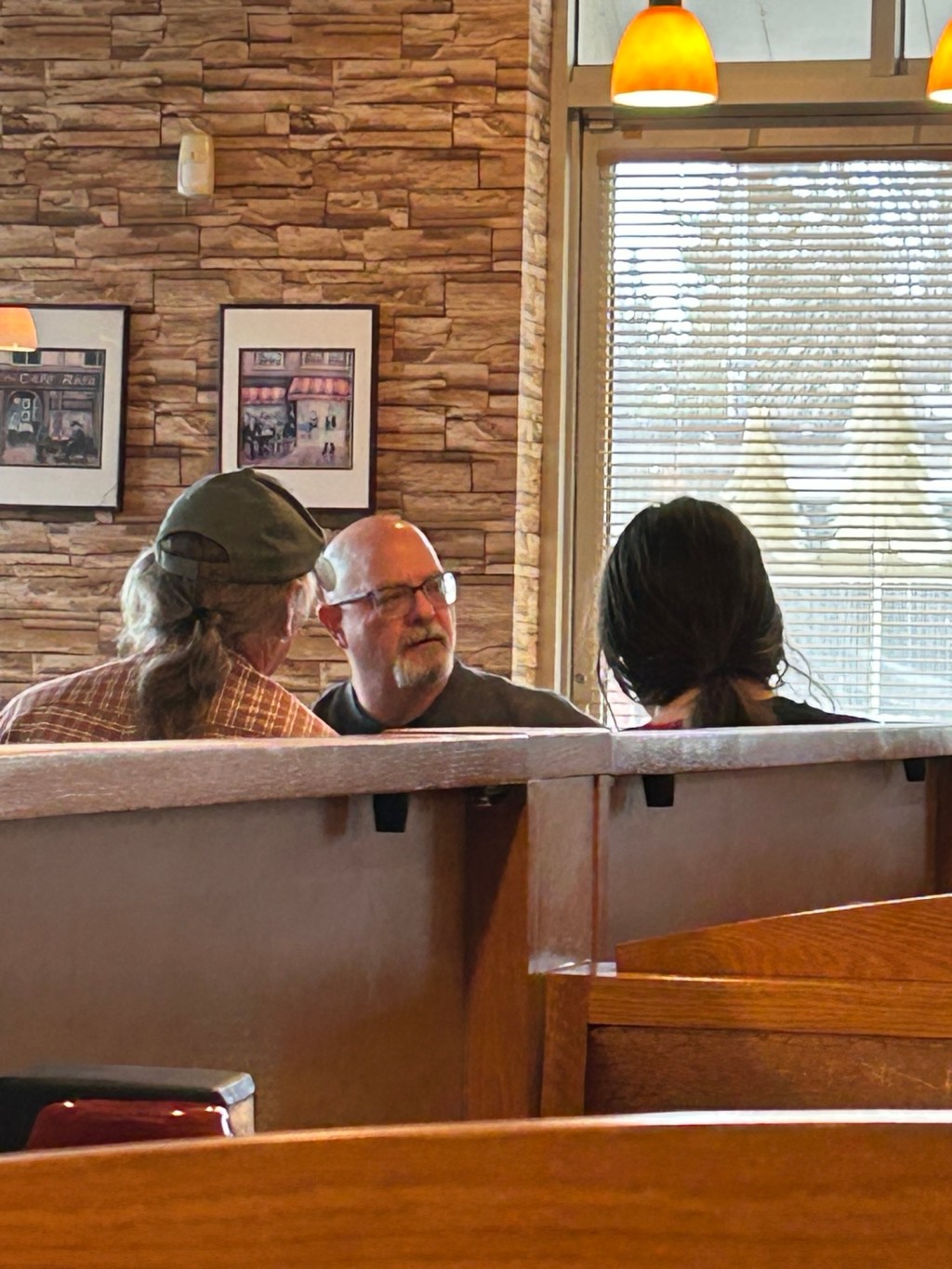 One Male Who Shaves His Head With A Razor And Shaving Cream, And Another Male With Ridiculous Long Hair, And Wearing His Long Hair Into A Ponytail; Pictured Sitting Together In A Booth At A Restaurant.