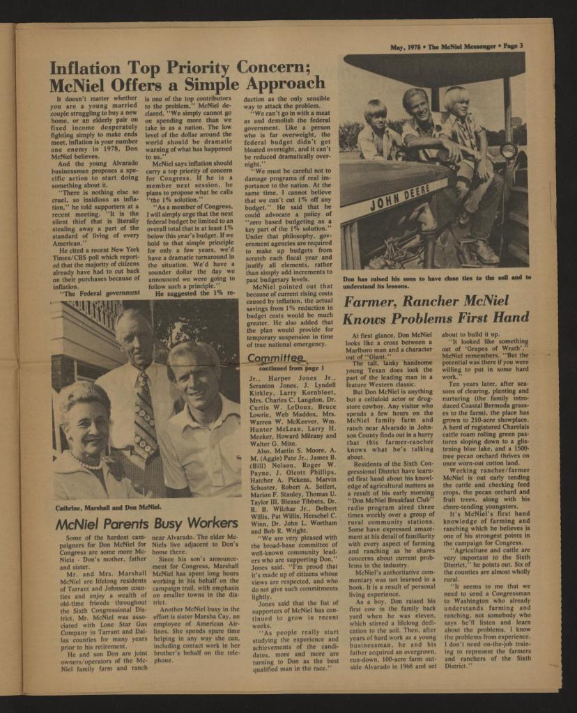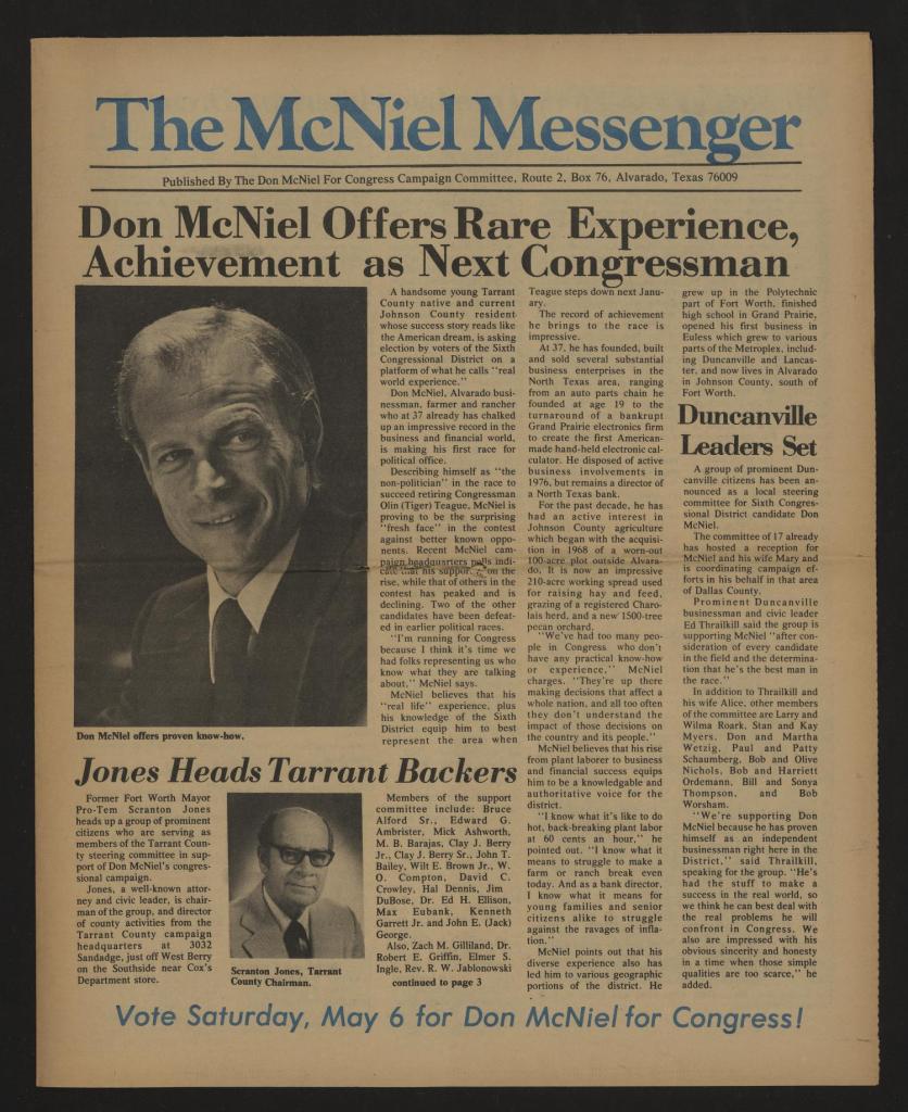 Moreover, Don McNiel had unsuccessfully ran as a member of the United States House of Representatives from Texas in 1978m and again, unsuccessfully during the years 1986 and 1988 (Scans of the McNiel’s Newsletter titled “The McNiel Messenger” courtesy of The Portal To Texas History by the University of North Texas).