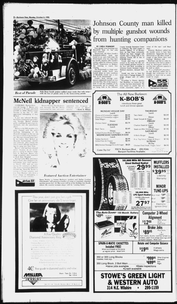 Below is a scan and a digitization of the Issue of the Burleson Star Newspaper from October 6, 1986; with a News Article about the last of the kidnappers to be tried and convicted; George Thomas Barnes (Scans of this Issue of the Burleson Star Newspaper courtesy of The Portal To Texas History by the University of North Texas):